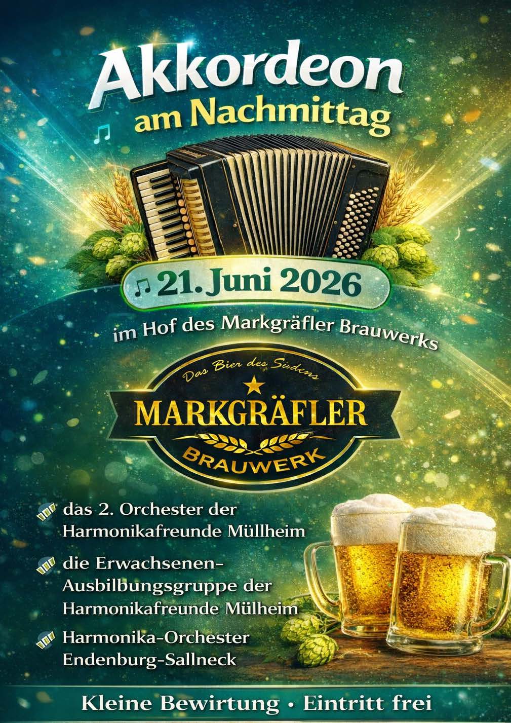 Harmonikafreunde in der Region Am Sonntag, 21.06.2026 sind wir zu Gast beim Markgräfler Brauwerk in Tannenkirch. Zwischen 14.30 - 18.00 Uhr gestalten wir gemeinsam einen gemütlichen Nachmittag mit Musik, guter ...