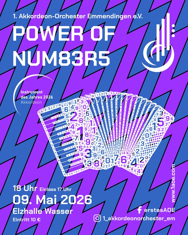 Herzliche Einladung zu unserem Frühjahrskonzert! Erleben Sie einen bunten Abend mit Stücken rund um das Motto „Power of Numbers“ bei Essen und Getränken.