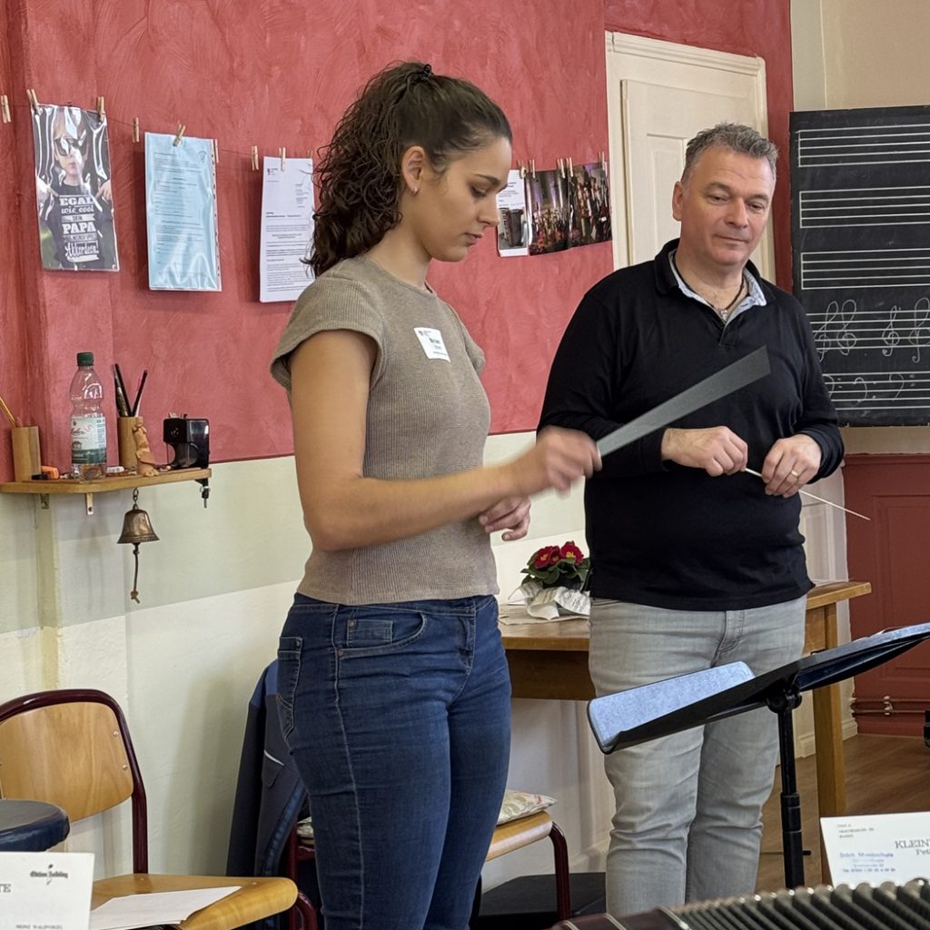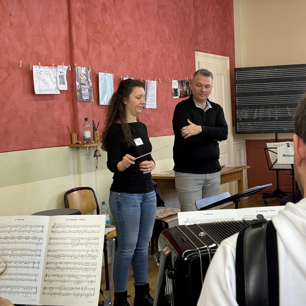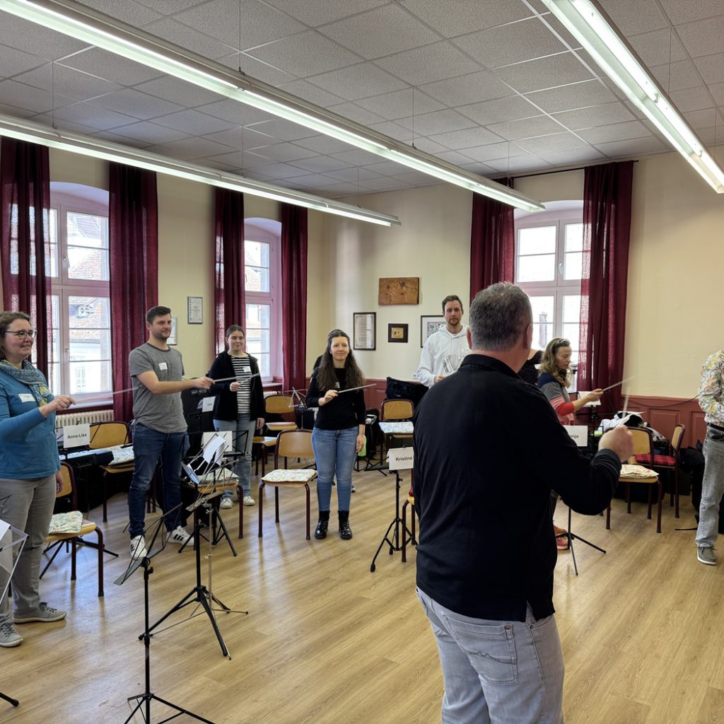 Der DHV-Bezirk Breisgau veranstaltete, auf vielfachen Wunsch, Anfang März in Müllheim unter der Leitung des Bezirksdirigenten Franco Coali einen Dirigier-Workshop für Anfänger und Einsteiger. Die 13 Teilnehmenden profitierten in lockerer und freundlicher Atmosphäre von einer klaren Orientierung: Learning by doing stand im Vordergrund und der Kurs bot einen guten Überblick ohne Druck oder Erwartungshaltung. Die Inhalte reichten von der Grundschlagtechnik über den Aufbau einer Probe bis hin zu wichtigen Punkten fürs Dirigieren, wobei viele verschiedene Taktarten und Einsätze durchgespielt wurden. Die Erklärungen von Dozent Franco Coali waren sehr verständlich, geduldig und hilfreich – seine Tipps wurden besonders geschätzt.
